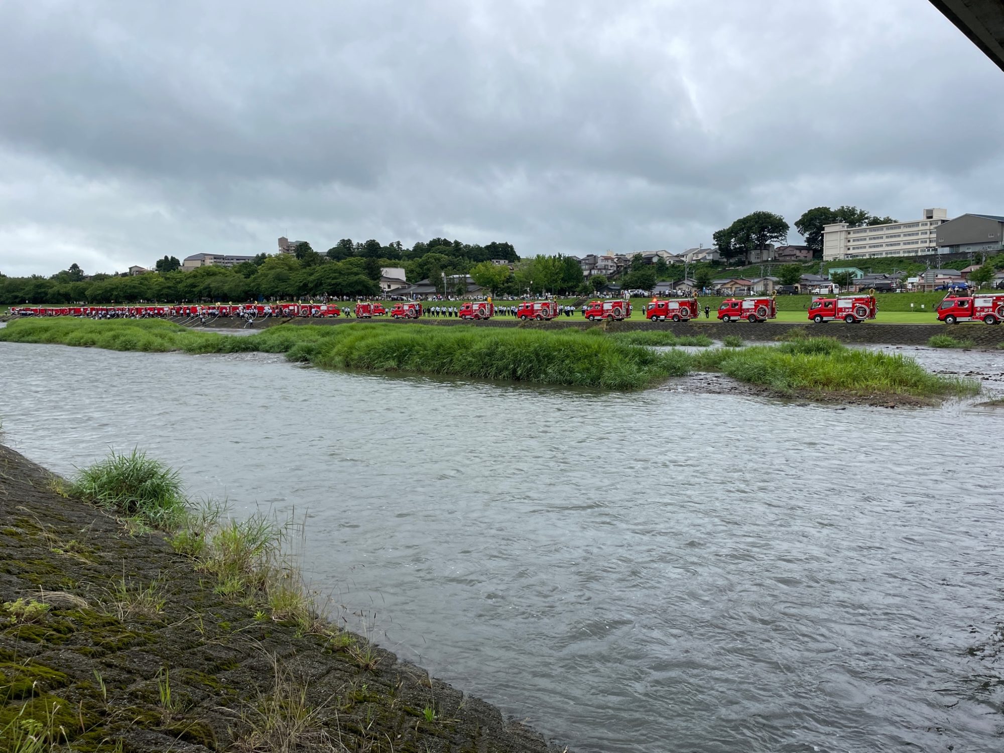 どうも「金沢市消防団連合検閲」と言われるイベントらしく、ポンプ車が川の水から給水しながら天高く放水して火消しの心意気を決意することを、サラシを巻いてふんどし姿になって訓練しています。意外とこれを見るのが好きで毎年覗いていますが、消防車の集まる様子がトミカの働くクルマを見ているようで、なにか和んだ気持ちになります。